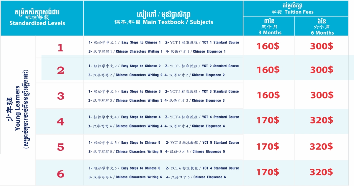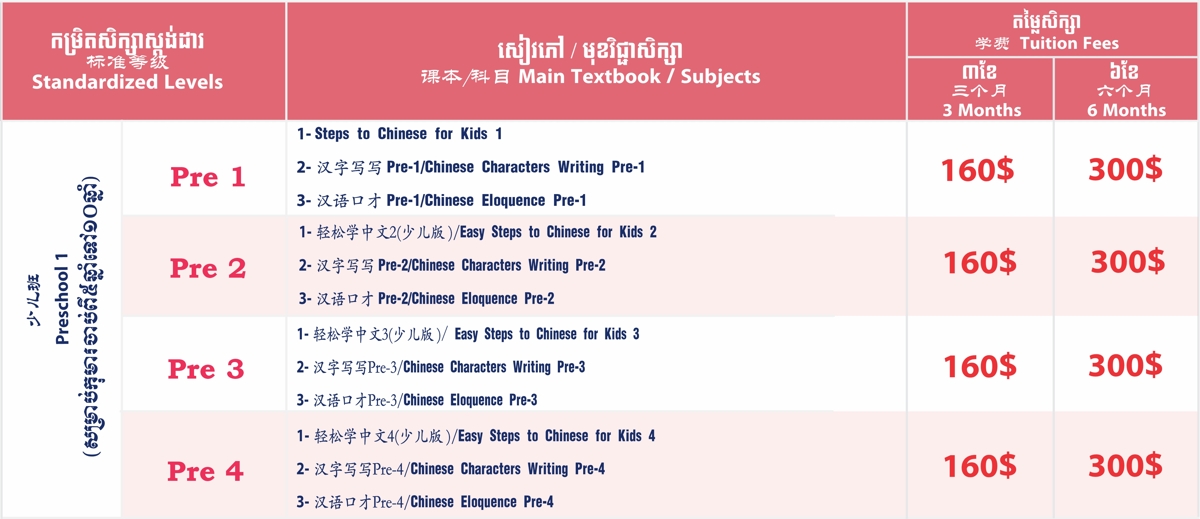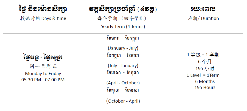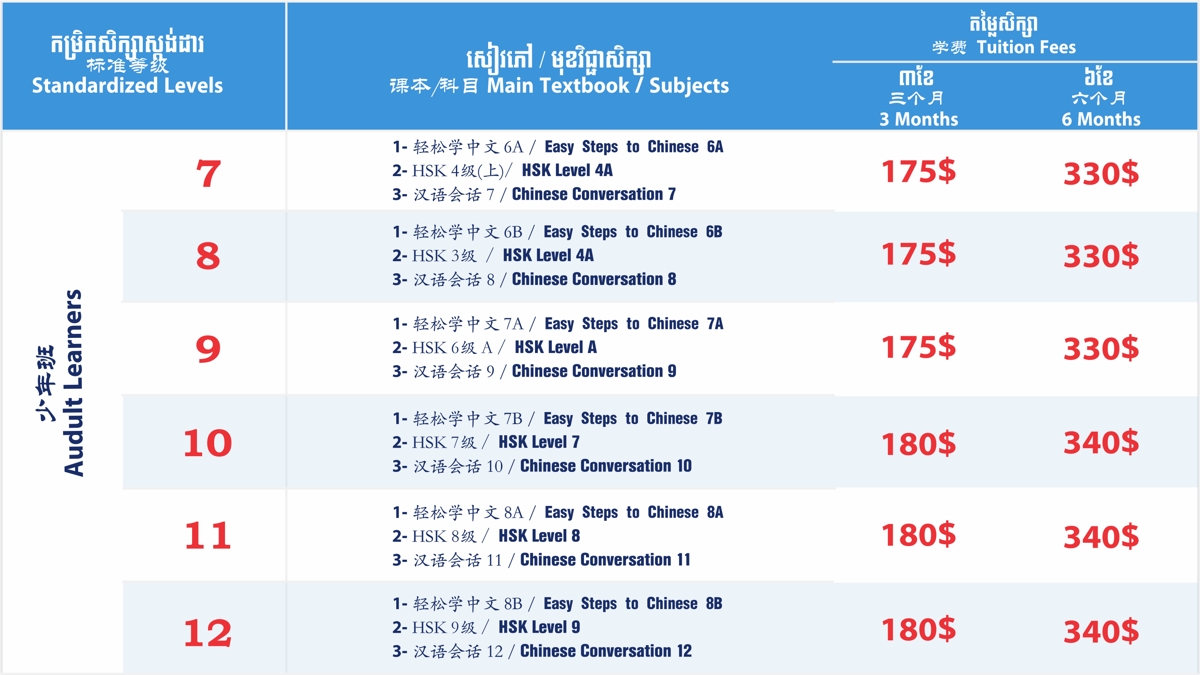 កម្មវិធីសិក្សាចំណេះទូទៅ កម្មវិធីសិក្សាភាសាអង់គ្លេសទូទៅ កម្មវិធីសិក្សាភាសាចិនទូទៅ កម្មវិធីអភិវឌ្ឍបញ្ញា IMA កម្មវិធីត្រៀមប្រឡងតេស្តអន្តរជាតិកម្មវិធីសិក្សាបន្ថែមទាំង១២
