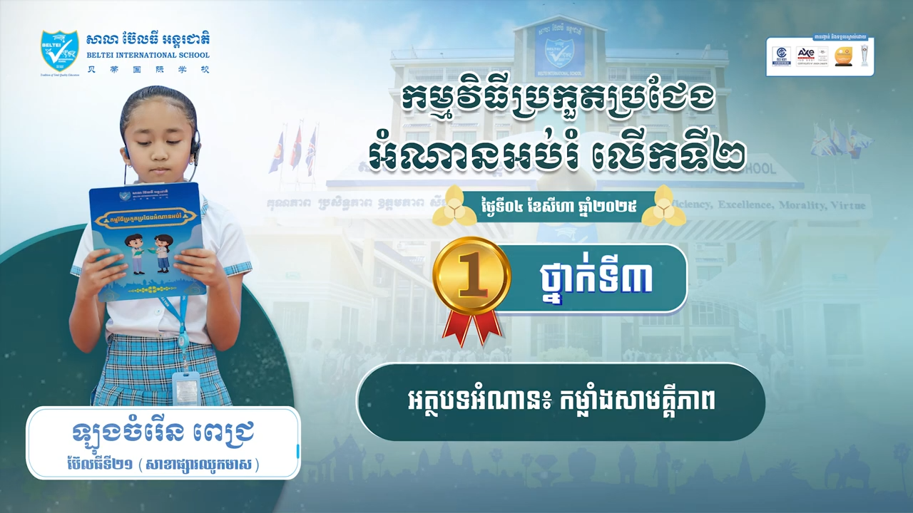សាលា ប៊ែលធី អន្ដរជាតិ បានរៀបចំកម្មវិធីប្រកួតប្រជែងនិយាយភាសាអង់គ្លេស លើកទី២១ វគ្គផ្ដាច់ព្រ័ត្រ កម្រិតប៊ែលធី សម្រាប់សិស្សានុសិស្សកម្រិតទី៣ ទី៦ ទី៩ និងទី១២ ក្រោមអធិបតីភាព ឯកឧត្តម លី ប៊ុនឆៃ អគ្គនាយករង ប៊ែលធី គ្រុប និងជាប្រធានគណៈគ្រប់គ្រងនាយកសាខា។ កម្មវិធីនេះបានប្រព្រឹត្តទៅ នាព្រឹកថ្ងៃព្រហស្បតិ៍ ៩កើត ខែមាឃ ឆ្នាំរោង ឆស័ក ព.ស.២៥៦៨ ត្រូវនឹងថ្ងៃទី៦ ខែកុម្ភៈ ឆ្នាំ២០២៥ នៅសាលសហសិក្សា នៃសាលា ប៊ែលធី អន្ដរជាតិទី៩ (សាខាស្ទឹងមានជ័យ)។